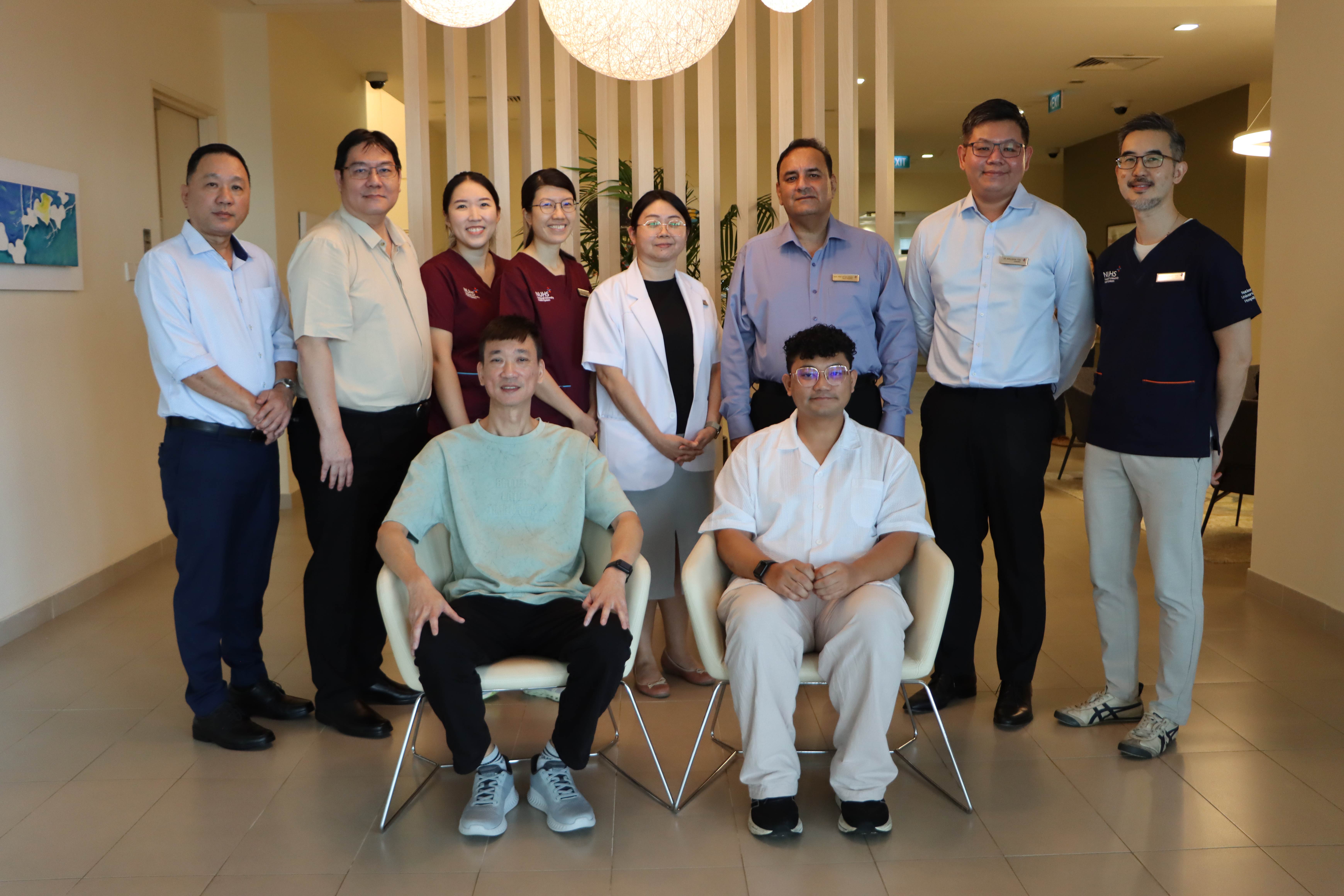 Patients Mr Chen Chye Song and Mr Nur Azhar Bin Hanafiah (seated, from left to right), with (standing, from left to right):- Mr Steven Tan, Human Resource Manager at Murata Electronics Singapore (Mr Chen’s workplace)