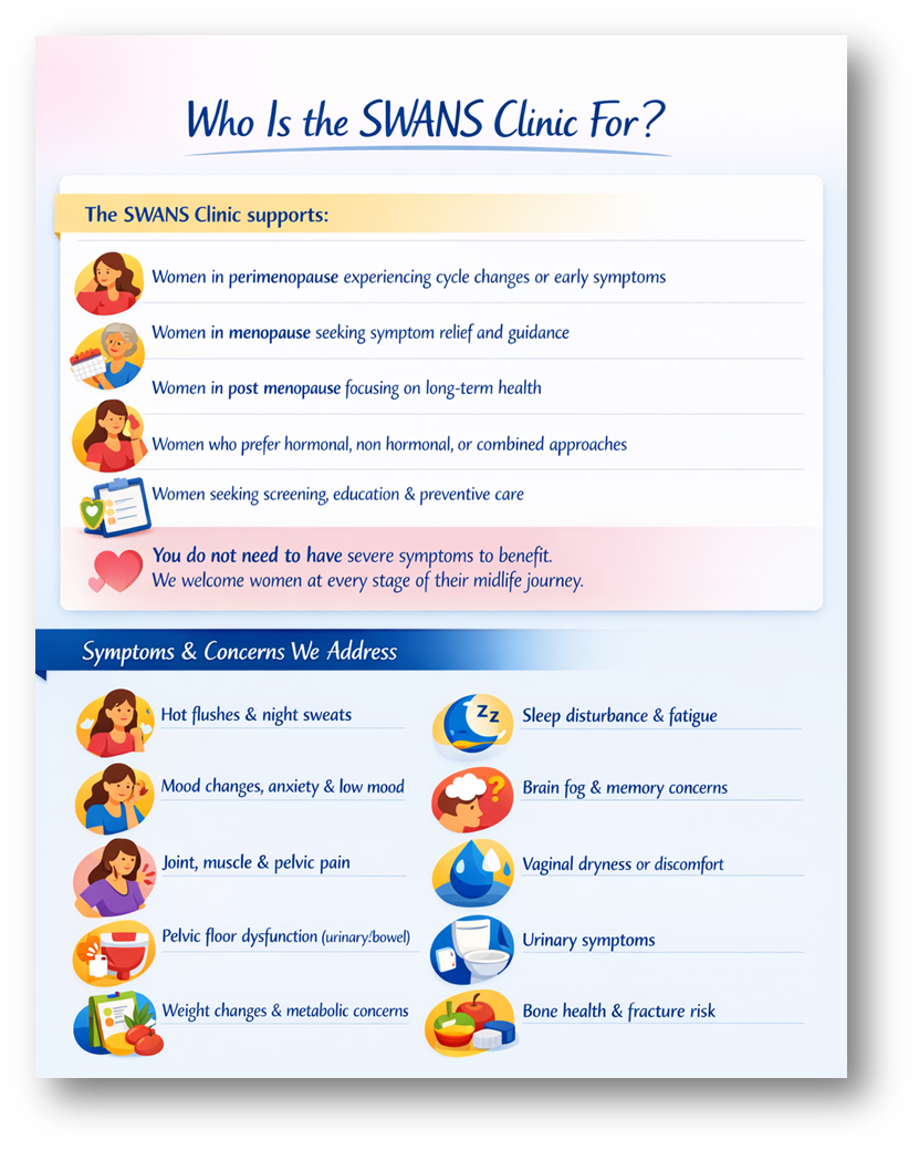 6. How long will I be followed up for?Follow up is tailored to your needs. Some women attend for short term symptom management, while others choose ongoing care for long term health and preventive support.
