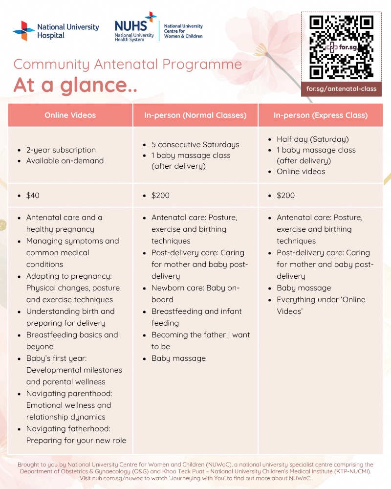 The classes are open to all expectant mothers and couples. Both NUH and non-NUH patients are welcome to sign up.