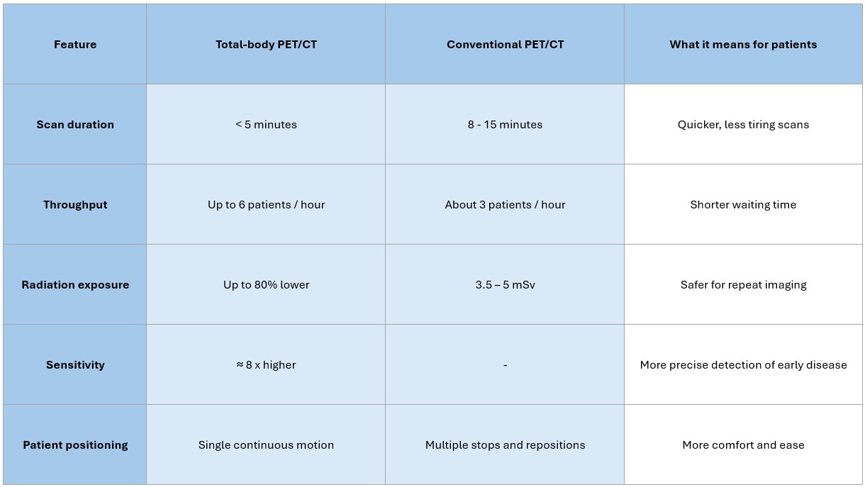 The new total-body PET/CT system captures the whole body in a single, continuous motion without any pauses nor repeated repositioning. The process takes less than five minutes and uses up to 80 per cent less radiation than before.